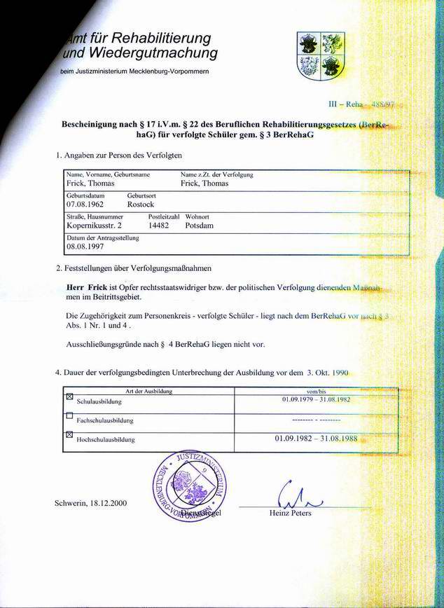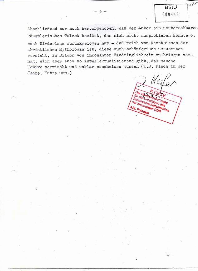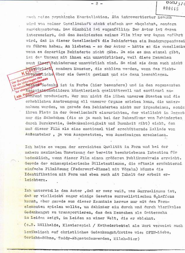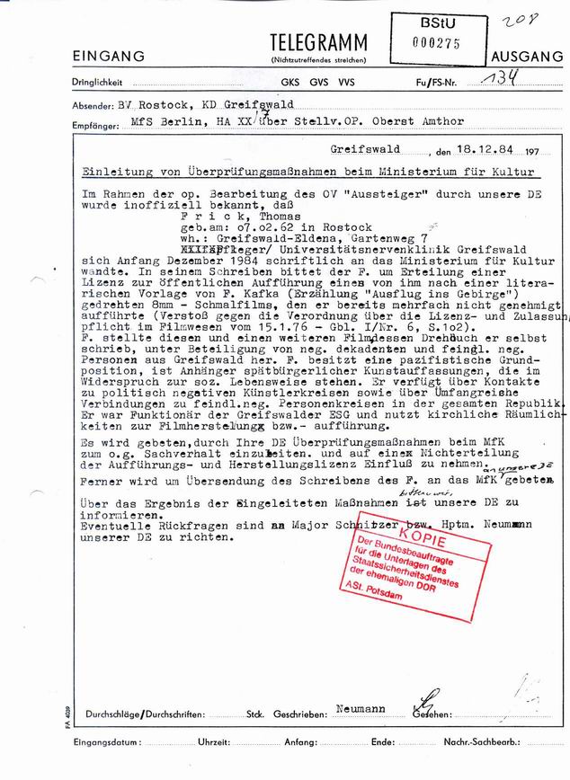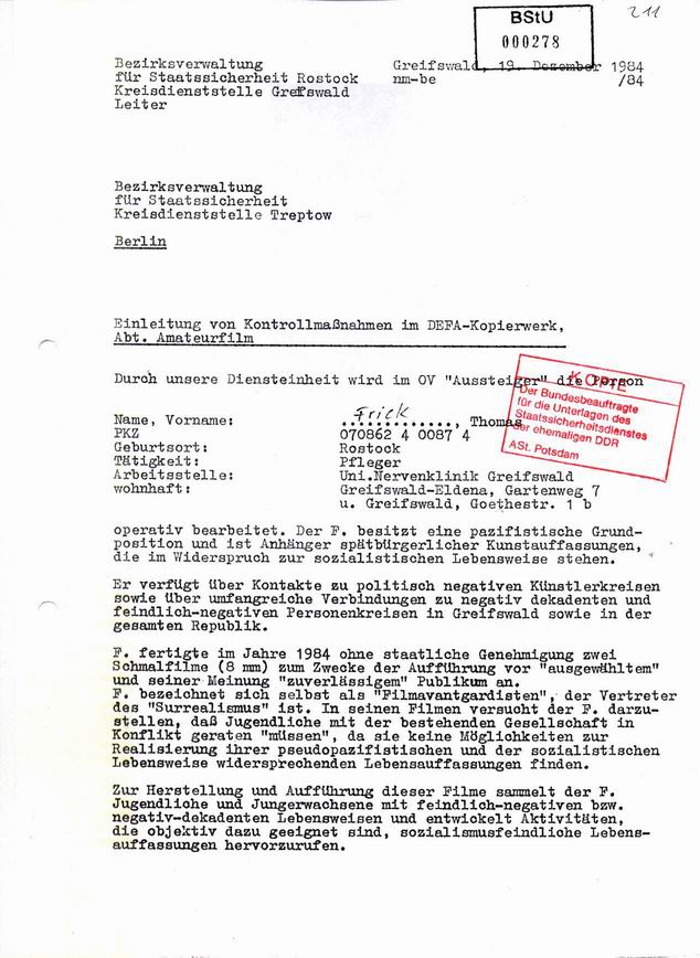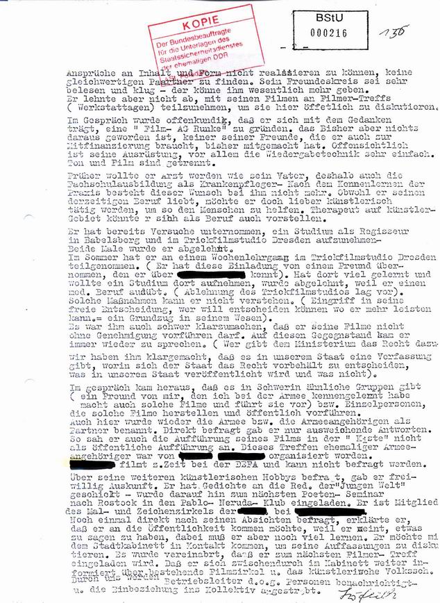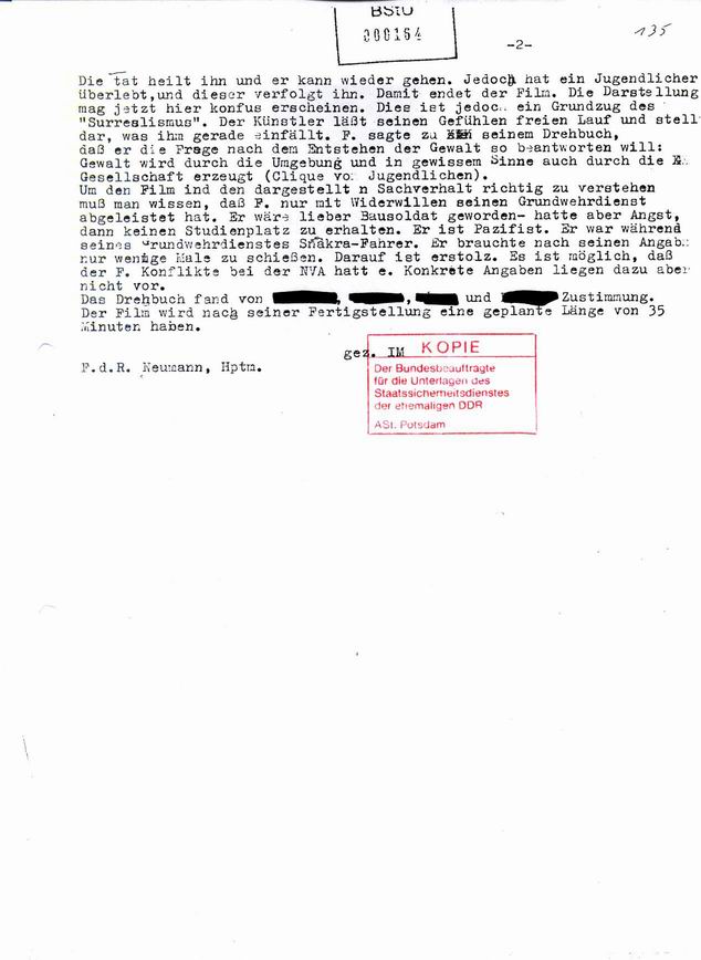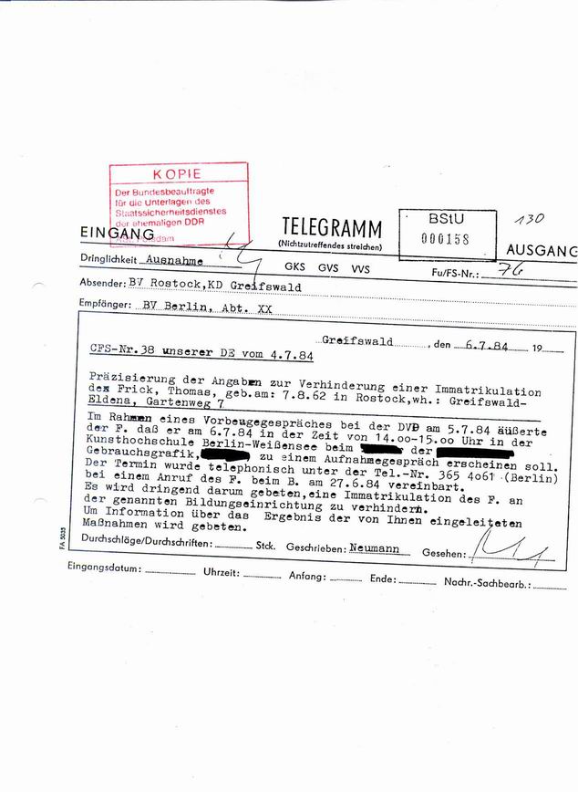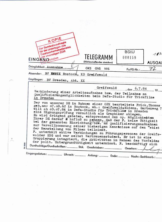 “Maßnahme zu Verhinderung einer Immatrikulation” (Kunsthochschule Weißensee und Trickfilmstudio Dresden):